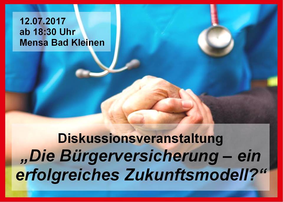 Wir möchten mit Ihnen am 12. Juli 2017 ab 18:30 Uhr in der Mensa Bad Kleinen (Schulstraße 17) über die Bürgerversicherung diskutieren und Sie über dieses Thema informieren. Mit dieser Veranstaltung setzen wir die Reihe unserer Themenveranstaltungen fort.
