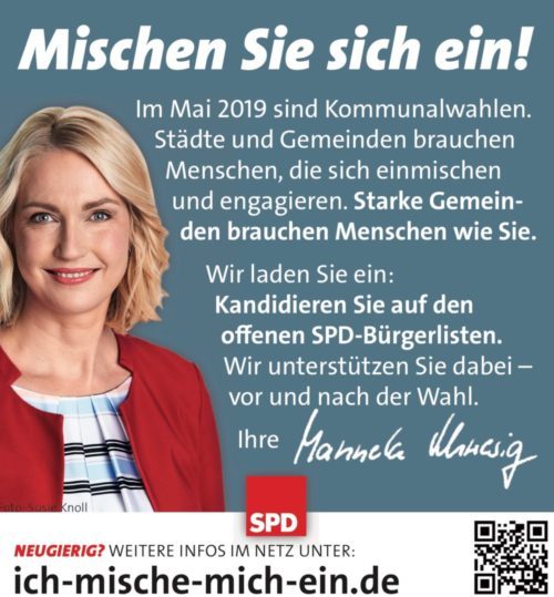 Der SPD-Ortsverein Bad Kleinen-Hohen Viecheln ruft alle Bürgerinnen und Bürger dazu auf, sich in die Kommunalpolitik einzubringen. Die nächste Sitzung des Ortsvereins findet am 06.03.2019 ab 19:00 Uhr in der Gallentiner Chaussee 11 in Bad Kleinen statt. Alle Bürgerinnen und Bürger sind dazu herzlich eingeladen.
