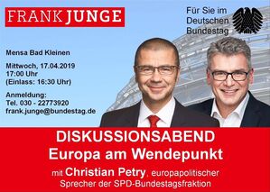 Der SPD-Bundestagsabgeordnete Frank Junge lädt am 17.04.2019 zusammen mit dem europapolitischen Sprecher der SPD-Bundestagsfraktion Christian Petry zu einer öffentlichen Veranstaltung ein. Los geht es um 17:00 Uhr in der Mensa Bad Kleinen. Kommen Sie vorbei und diskutieren Sie mit.